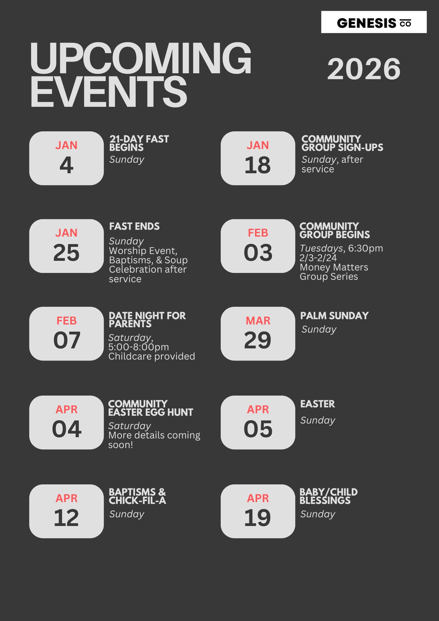 The year of 2026 is full of ministry and fun activities. Here is a calendar of the first quarter of 2026. We invite you to come participate with us in our church as we pursue Christ and Community together. Fill out a Connect Card online or Plan a Visit with us. We would love to meet you.